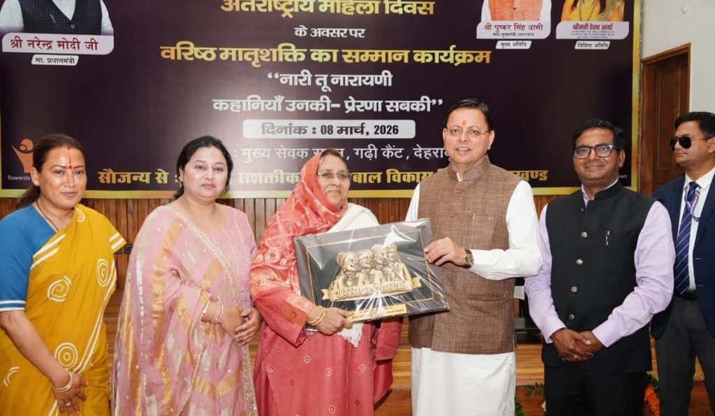 देहरादून : मुख्यमंत्री श्री पुष्कर सिंह धामी ने अंतर्राष्ट्रीय महिला दिवस पर 38 वरिष्ठ महिलाओं को किया सम्मानित, कहा- “पहाड़ की असली ताकत उसकी मातृशक्ति”वरिष्ठ मातृशक्ति के त्याग और संघर्ष को नमन- मुख्यमंत्री ने कहा, महिलाओं के संस्कारों से मजबूत होती है समाज और राष्ट्र की नींव