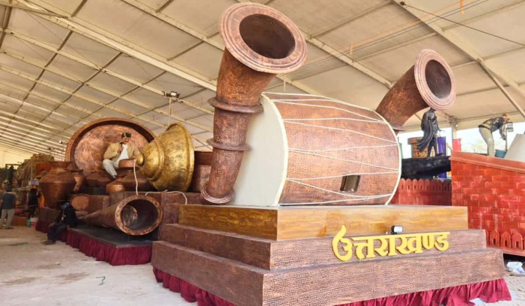 झांकी के अग्र भाग में ढोल और रणसिंघा जैसे पारंपरिक वाद्ययंत्रों की तांबे से निर्मित कलात्मक प्रतिकृतियां दर्शकों को उत्तराखंड की लोकसंस्कृति से परिचित कराएंगी। इसके साथ ही तांबे के मंजीरे की विशाल आकृति शिल्प कौशल की बारीकियों को जीवंत रूप में प्रस्तुत करेगी।