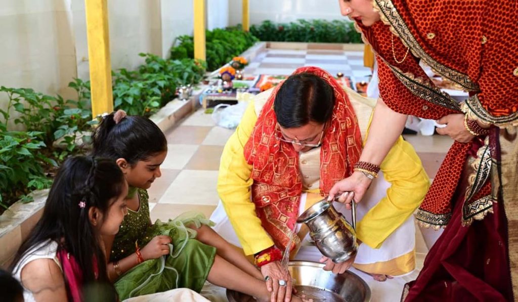 देहरादून : पावन रामनवमी के शुभ अवसर पर एक आध्यात्मिक और सांस्कृतिक वातावरण देखने को मिला, जब उत्तराखंड के मुख्यमंत्री पुष्कर सिंह धामी ने अपने आवास पर पारंपरिक विधि-विधान के साथ कन्या पूजन का आयोजन किया। इस अवसर पर उन्होंने देवी स्वरूप मानी जाने वाली छोटी बालिकाओं का पूरे सम्मान और श्रद्धा के साथ स्वागत किया। कार्यक्रम के दौरान मुख्यमंत्री ने विधिवत पूजन कर बालिकाओं के चरण स्पर्श किए, उन्हें भोजन कराया और उनका आशीर्वाद प्राप्त किया, जो भारतीय संस्कृति में नारी शक्ति के सम्मान और पूजन का प्रतीक माना जाता है।