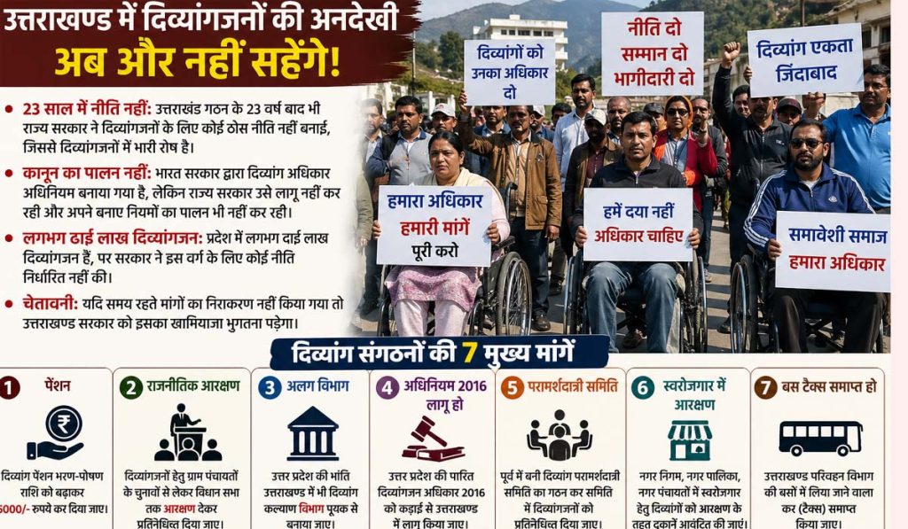देहरादून : उत्तराखण्ड में दिव्यांगजनों से जुड़े मुद्दे एक बार फिर गंभीर रूप से सामने आए हैं, जहां राज्य गठन के 23 वर्ष बाद भी उनके लिए कोई समग्र और ठोस नीति न बनाए जाने को लेकर व्यापक असंतोष व्यक्त किया जा रहा है। विभिन्न दिव्यांग संगठनों ने सरकार की कार्यप्रणाली पर सवाल उठाते हुए कहा है कि इतने लंबे समय के बाद भी इस वर्ग की आवश्यकताओं को व्यवस्थित रूप से संबोधित नहीं किया गया, जिससे दिव्यांगजन खुद को उपेक्षित और असुरक्षित महसूस कर रहे हैं। संगठनों का कहना है कि यह स्थिति केवल प्रशासनिक लापरवाही ही नहीं, बल्कि संवेदनशीलता की कमी को भी दर्शाती है।
