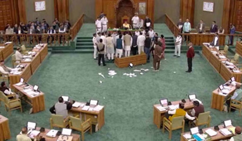 विपक्ष के हंगामे के दौरान कांग्रेस विधायकों ने कार्यसूची फाड़कर सदन में उछाल दी और वेल में धरने पर बैठ गए। इस बीच सचिव की टेबल पलटने, माइक और टेबलेट तोड़ने की कोशिश भी की गई। विधानसभा अध्यक्ष ने इस पर गहरी नाराजगी व्यक्त की और इसे बेहद दुखद करार दिया।